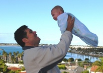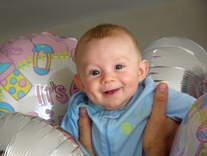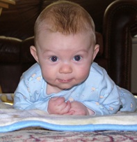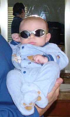 I've often said that most of my ethical growth over the adult part of my life has come largely through dating (slight compromise unerringly leads to immediate unambiguous feedback). I'm sure parenting will present interesting dilemmas. A first occurred the other night at 4:00am. Dash has his various noisy periods of sleep, often cuz he's hungry, at around 5:00am cuz he's gassy, and eventually because he's up for the day. Well at 4:00am his eyes were wide open, he seemed to be "up." Leigh and I were awake but hoping to get back to sleep. "Don't excite him, maybe he'll go back to sleep." We'll Dash locks those big baby blues on to yours and breaks into his usual big smile (after his usual long night's rest, he radiates a 'Oh boy, another day, another day!' energy, which would be appreciated all the more if he radiated it at 7:00am instead of 5:00am). I gave him a flat return so as not to encourage him to stay awake. I don't remember whether he went back to sleep but I do remember worrying about it through work the next day. "Do I want to send him the message that happiness is conditional?" Definitely not. So from now on: big smile automatically gets a big smile. |
